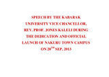 SPEECH BY THE KABARAK UNIVERSITY VICE CHANCELLOR, REV. PROF. JONES KALELI DURING THE DEDICATION AND OFFICIAL LAUNCH OF NAKURU TOWN CAMPUS ON 20TH SEP, 2013